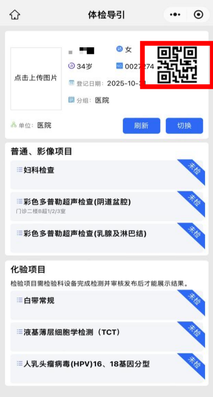 妇检当天,进入微信小程序“中国地质大学医院师生端”,点击“体检导引”—→右上角“二维码”。持二维码至体检中心101室,扫码打印导检单与条码。