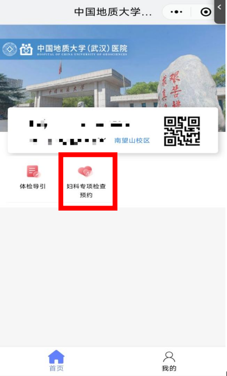 体检当天,打开微信小程序“中国地质大学医院师生端”,点击“体检导引”——选择“教工妇检套餐”——点击右上角“二维码”,医生扫码查体。