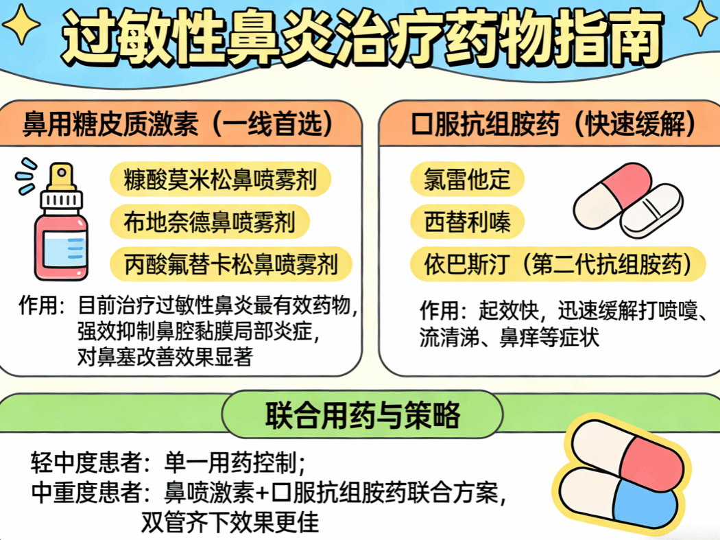 对于中重度患者,临床常采用 “鼻喷激素 + 口服抗组胺药” 的联合方案,双管齐下,效果更佳。